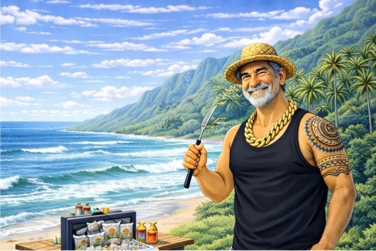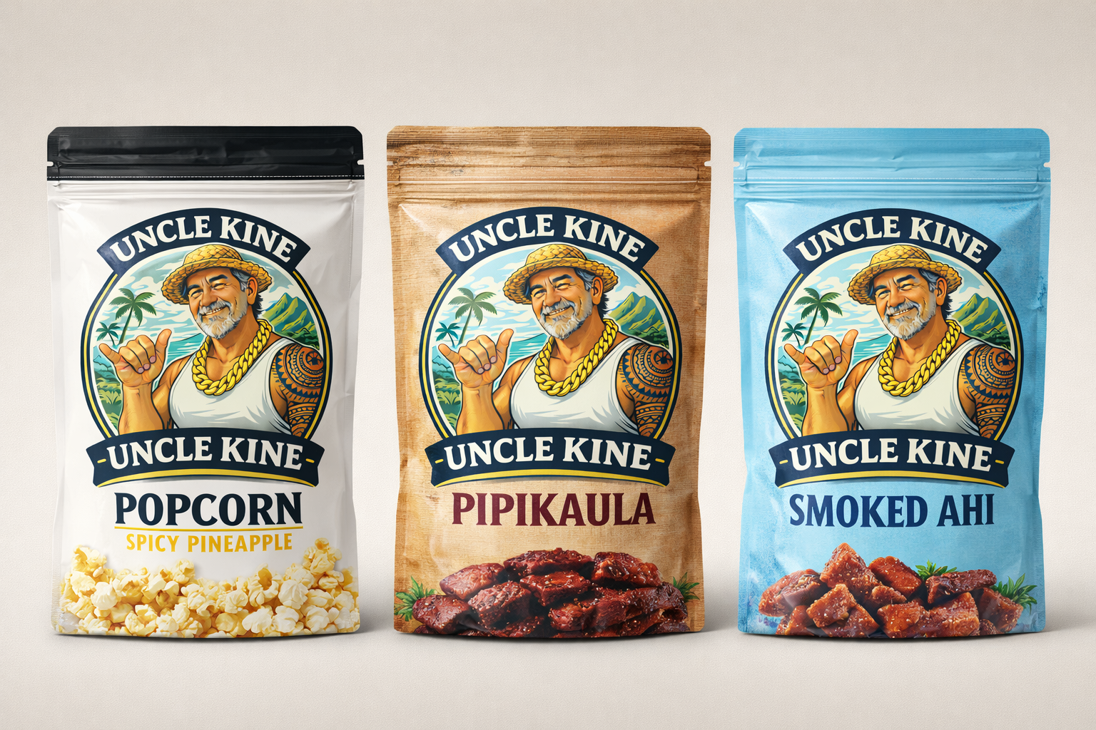 Uncle Kine Snacks went out and researched old favorite snacks of plantation times, fishermen, hunters and our ohana and of course our uncles. As you know we had all kine ideas and everyone get one uncle that is a hunter fisherman or the expert griller, this company is an homage to them and the ol school lesson they give. SO lift a snack and a drink to the OG Uncles.